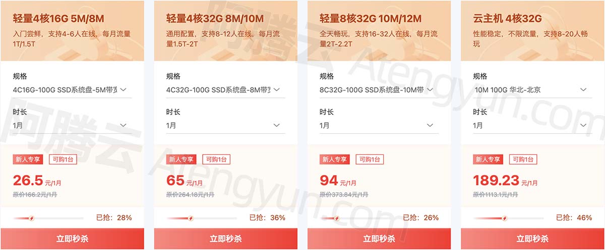 | 轻量4核32G 8M/10M | 4C32G | 8M/10M | 每月流量1.5T-2T | 支持8-12人在线 | 100G SSD系统盘 | 65元1个月、195元3个月 |